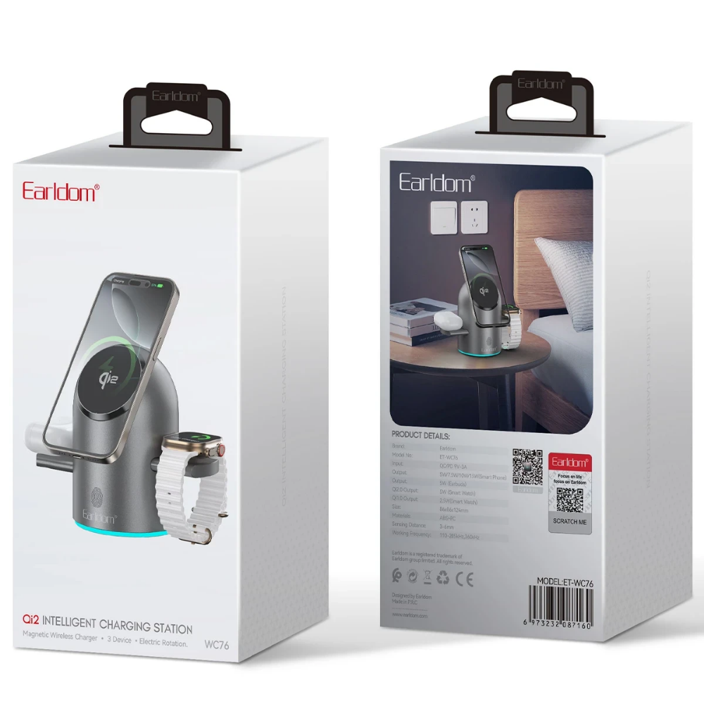 Earldom 3in1 15W Telefon 2.5W Saat ve 5W Airpods İçin Dönebilen Kablosuz Şarj Standı - Gri
